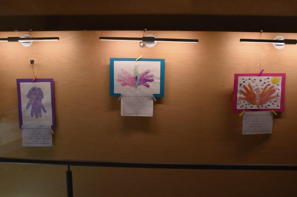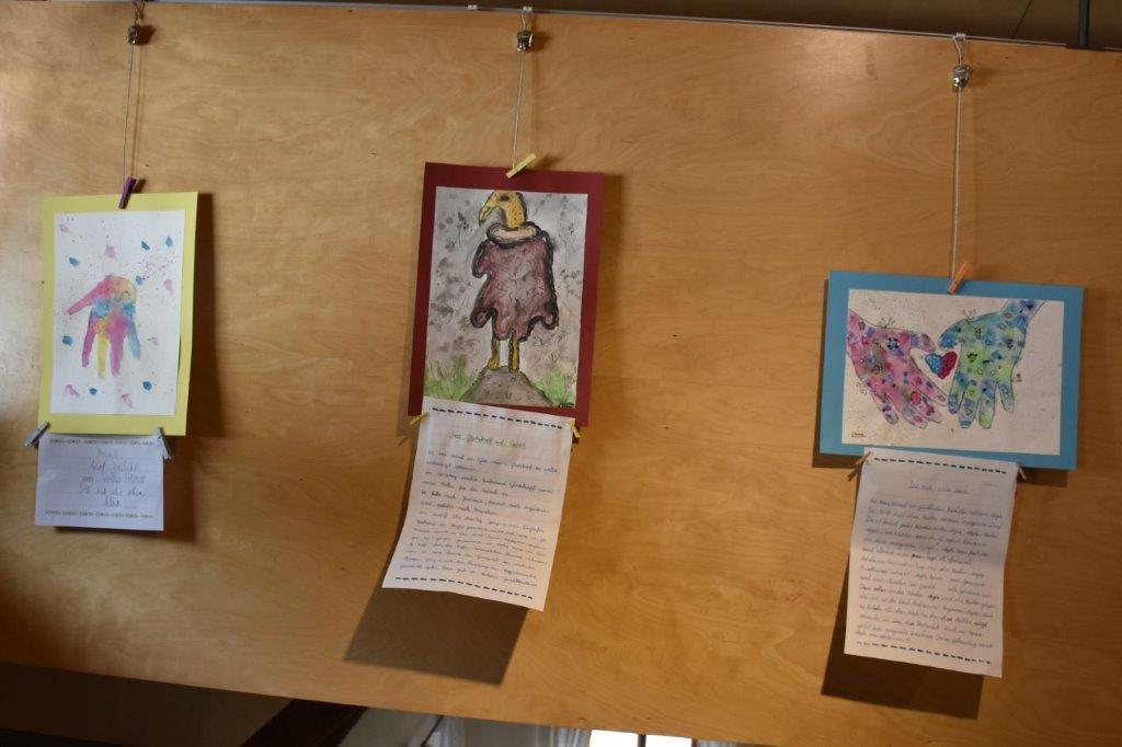 Endlich war es so weit! Wir durften unsere eigenen Werke präsentieren, welche im Workshop mit Frau Khuen – Belasi entstanden. Die Künstlerin zeigte uns die Methode Happy Painting und so verwandelten sich unsere gezeichneten Hände am Papier mühelos in bunte Pfauen, Tintenfische, Quallen, Dinos, Schokomonster… Gedichte und Fantasiegeschichten dazu erfanden wir im Deutschunterricht.